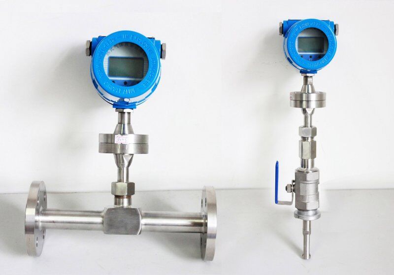 熱式氣體質量流量計是利用熱傳導原理測量氣體質量流量的儀表。熱式氣體質量流量計的傳感器由兩個基準級熱電阻(鉑RTD)組成。一個是質量速度傳感器T1,一個是測量氣體溫度變化的溫度傳感器T2。當這兩個RTD置于被測氣體中時,其中傳感器T1被加熱到氣體溫度以上的一個恒定的溫差,另一個傳感器T2用于感應被測氣體溫度。隨著氣體質量流速的增加,氣流帶走更多熱量,傳感器T1的溫度下降,要維持T1、、T2恒定的溫度差,T1的加熱功率就要增大。根據(jù)熱效應的金氏定律,加熱功率P、溫度差△T(T1-T2)與質量流量Q有確定的數(shù)學關系式。